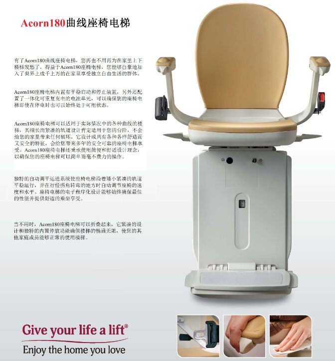 Acorn180座椅電梯可以適用于實(shí)際情況中的各種曲線的樓梯,其細(xì)長(zhǎng)而緊湊的軌道設(shè)計(jì)肯定適用于您的臺(tái)階,不會(huì)給您的家里帶來(lái)任何破壞。它設(shè)計(jì)成具有各種各樣舒適而又安全的特征,會(huì)給您帶來(lái)多年的安全可靠的座椅電梯享受。Acorn180座椅電梯還秉承使用簡(jiǎn)便和舒適設(shè)計(jì)理念,以確保您的座椅電梯可以簡(jiǎn)單而毫不費(fèi)力的操作。
